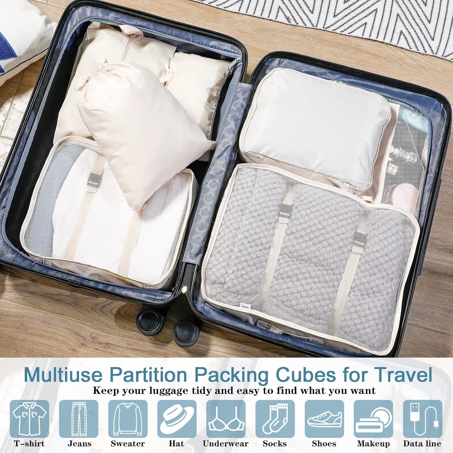 Multifunctional Bag: with different size, the packing cubes for suitcases can store and classify clothes, dirty laundry, bra, underwear, shoes, socks, cosmetics, towels, toiletries and electronics accessories well, travel luggage organizer is also applicable for family holidays, business trips, backpacking, camping, hiking, cruise vacations