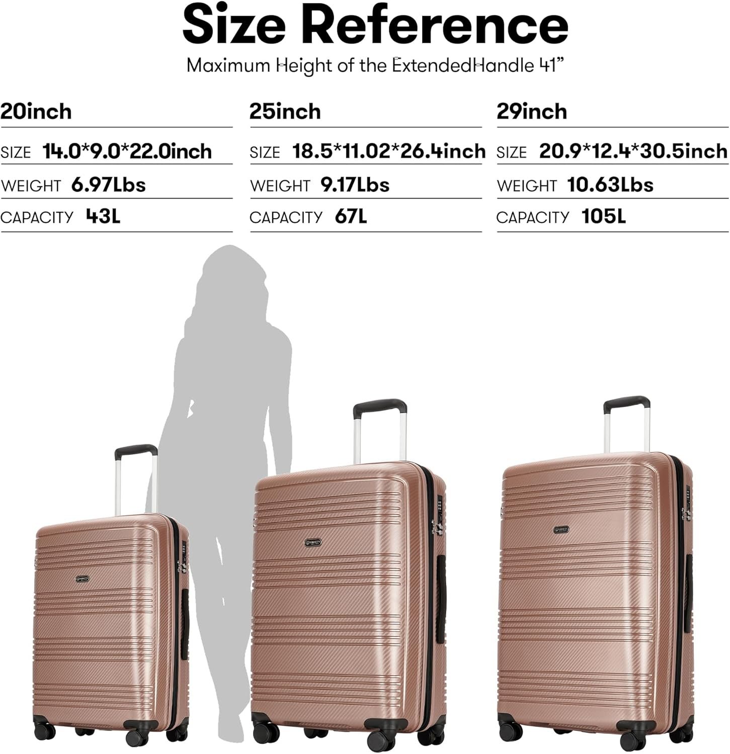 3 Piece Luggage Sets with Spinner Wheels:20in is best for carry on,25in & 29in large suitcase expands 20% for more Spaces.20inch carry on Luggage:22x14x9inch,Weight:6.97Lbs,Capacity:43L;25inch checked luggage:26.4×18.5x11inch,Weight:9.17Lbs,Capacity:80L;29inch large suitcase:30.5×20.9×12.4inch,Weight:10.63Lbs,Capacity:120L.