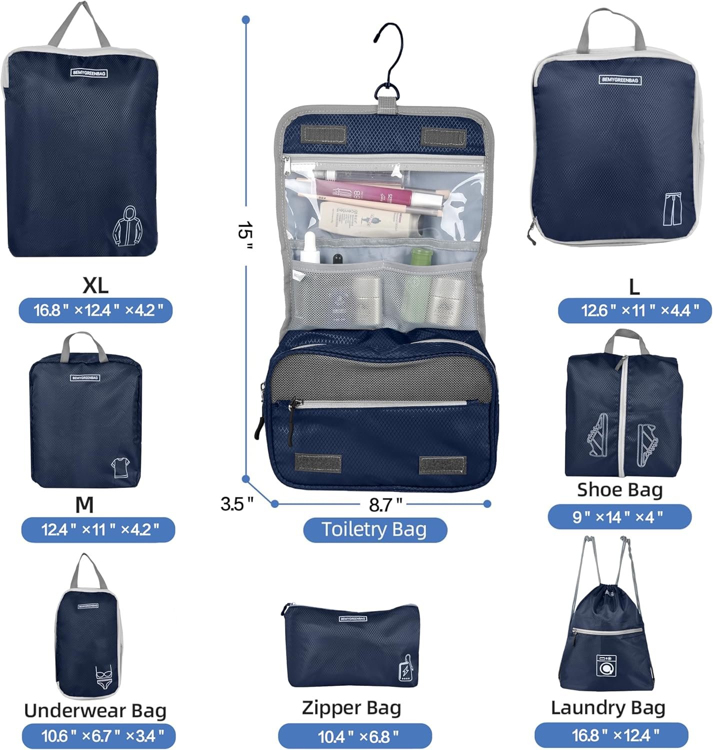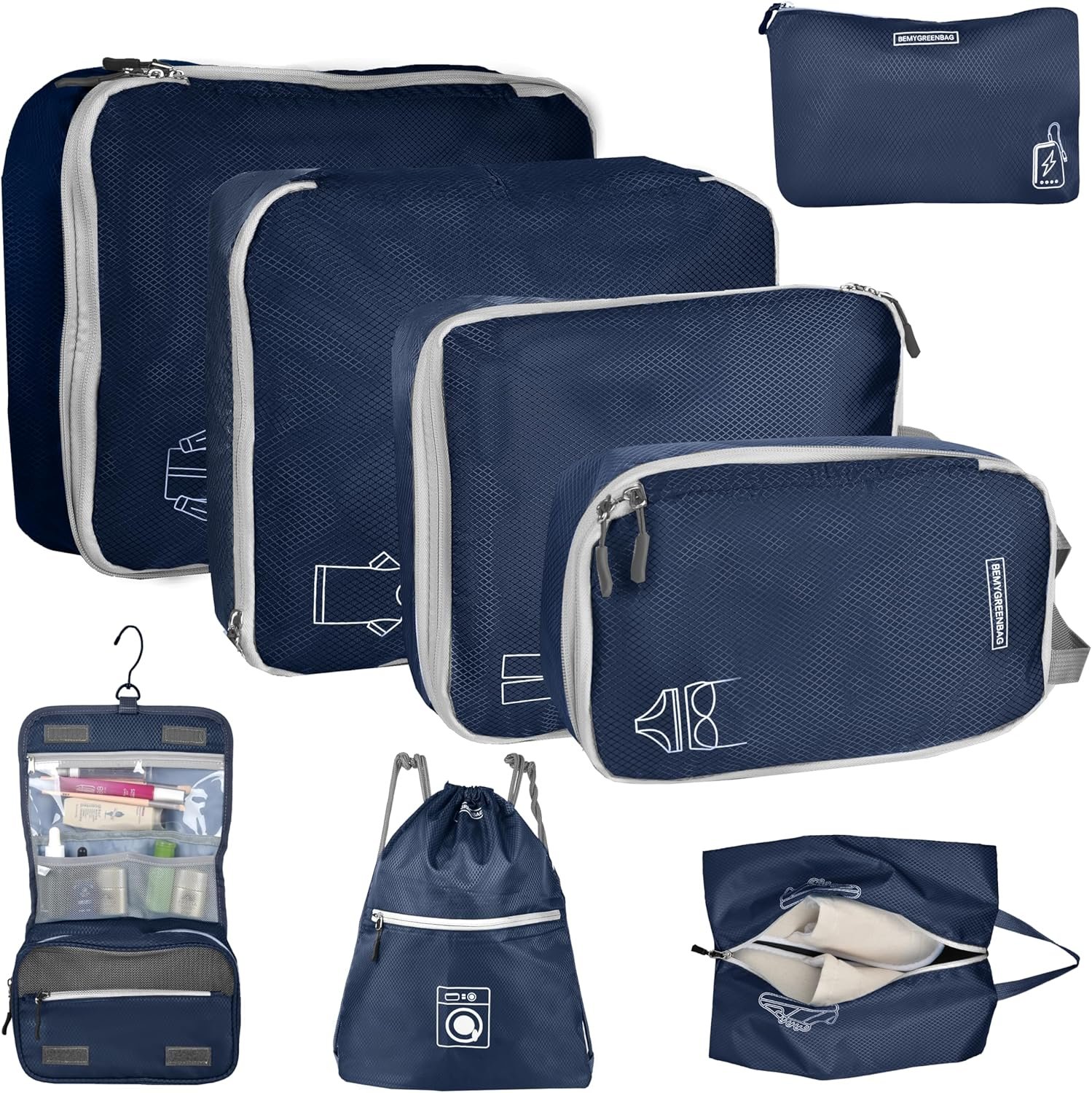 8 Set Expandable Compression Packing Cubes for Suitcases Travel Essentials Carry On Waterproof Storage Bag With Dry And Wet Separation Dark Blue