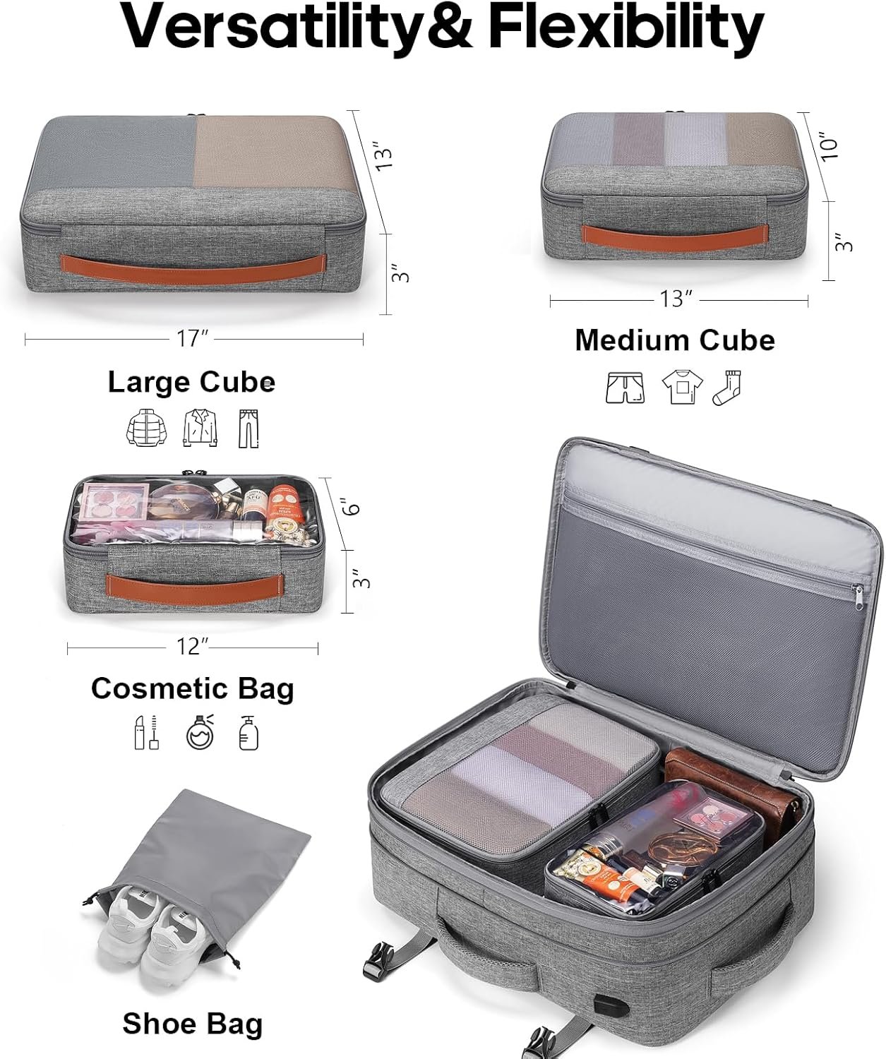3 Packing Cubes + 1 Shoe Pocket:Streamline your packing with three packing cubes and a dedicated shoe pocket. The shoe pocket keeps shoes separate, and the built-in USB port (charger not included) lets you charge devices on the go