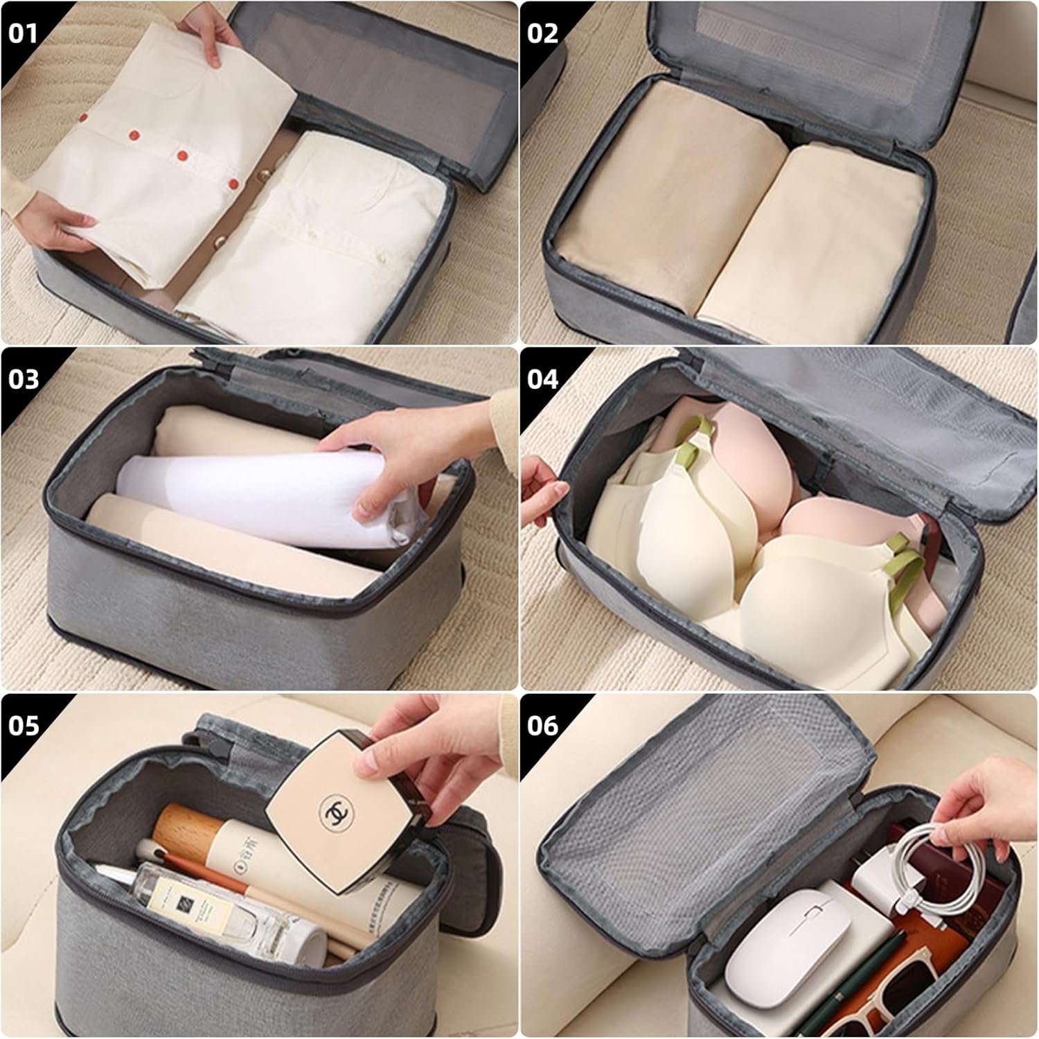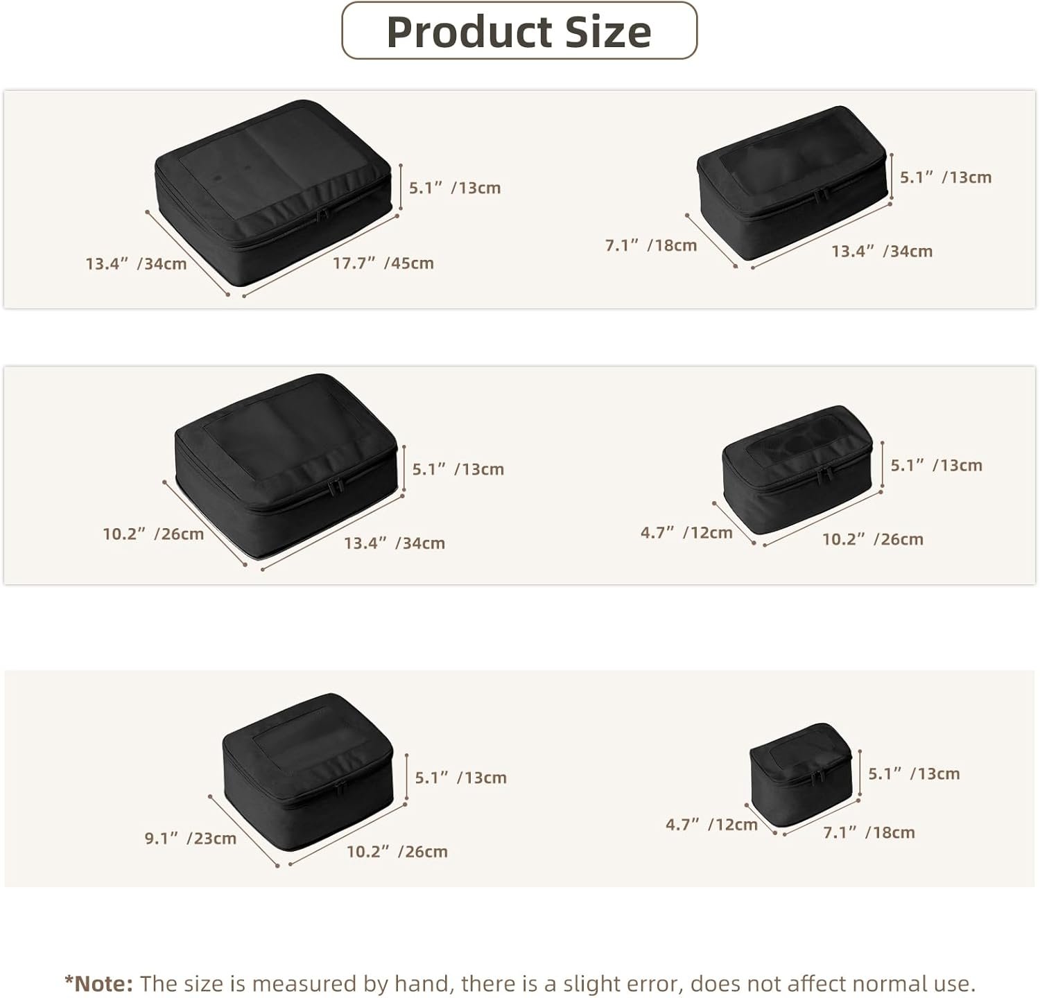 【COMPRESSION 6 PIECE SET SIZE】 Clothing organiser bags ①: 17.7X13.4X5.1in (for 2 winter coats); Clothing organiser bags ②: 13.4×10.2×5.1in (for 2 fall coats); Clothing organiser bags ③: 10.2×9.1×5.1in (for 6-8 T-shirts); Clothing organiser bags ④: 13.4X7.1X5.1in (for 3-5 pairs of pants); Clothing bag Clothing bag ⑤: 10.2×4.7×5.1in (for 6-8 bras); Clothing organiser bags ⑥: 7.1×4.7×5.1in (for 8-12 pairs of socks).