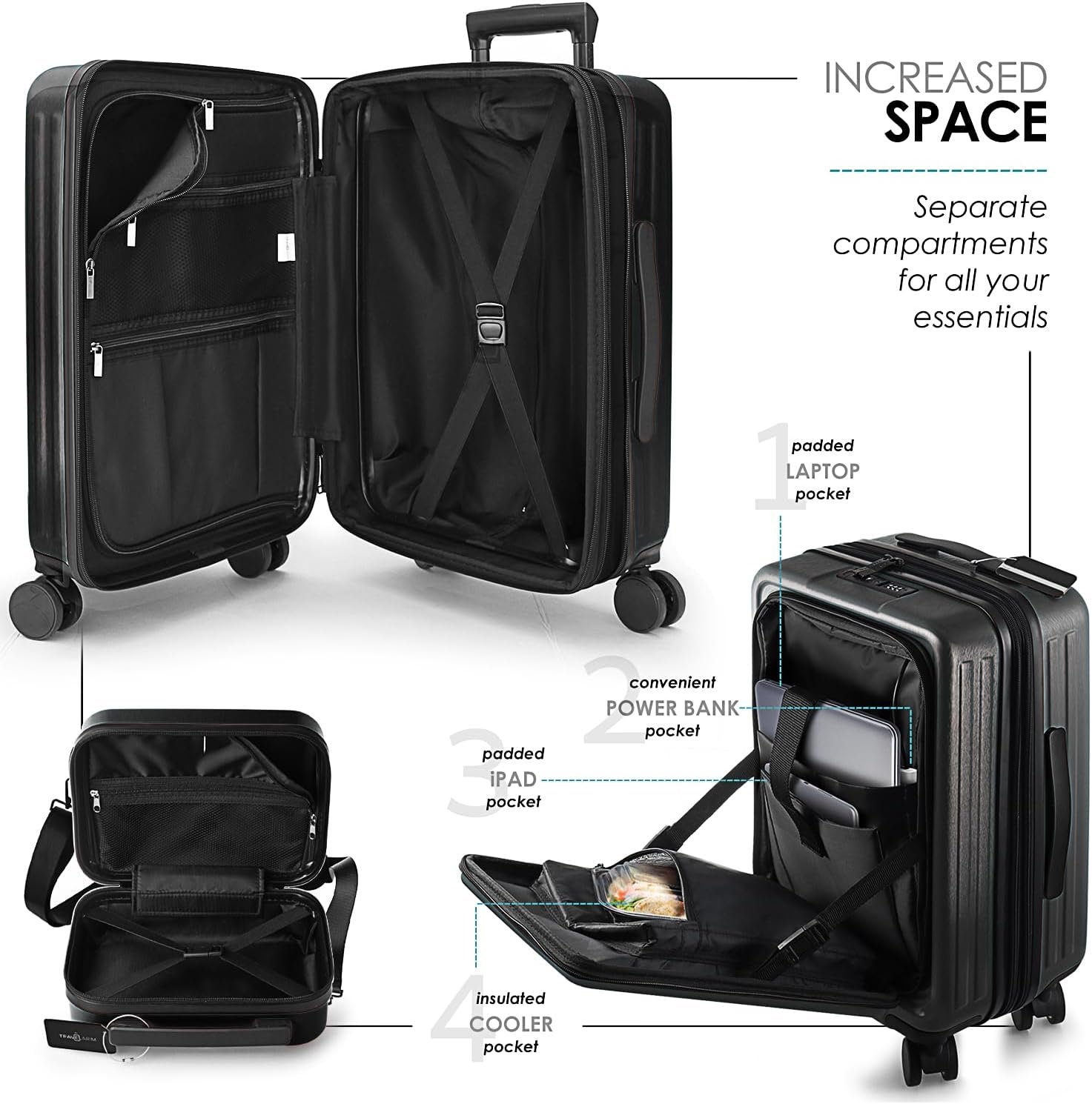 22 Inch Carry On Luggage: The carry on bag hard suitcase with wheels includes a padded laptop pocket, iPad pocket, and power bank pocket (power bank not included) that integrates with the exterior USB port to charge your devices; plus an insulated food pocket.