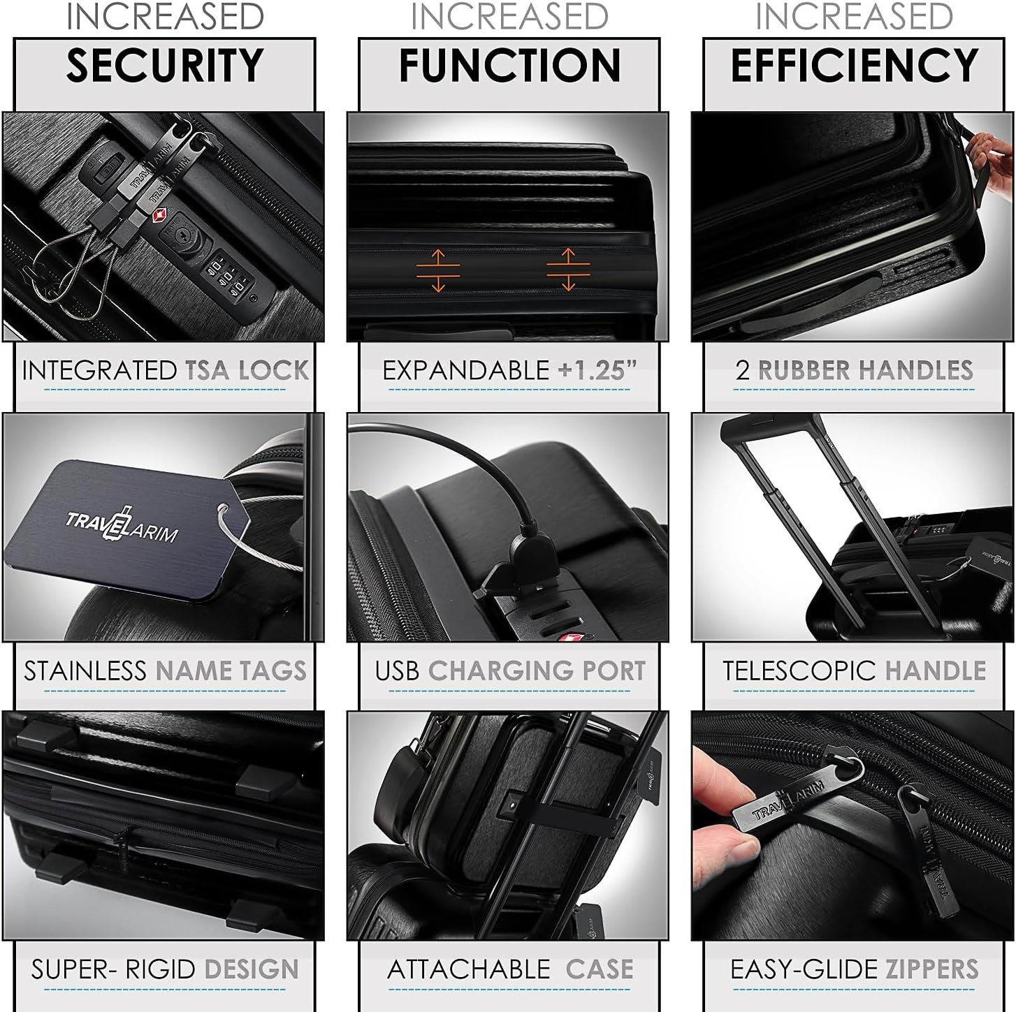 Luggage Sets with Spinner Wheels: Our large suitcases with wheels provide smooth 360° movement. This rolling suitcase, hardside luggage set includes telescoping handles, stainless steel name tags, and TSA locks.