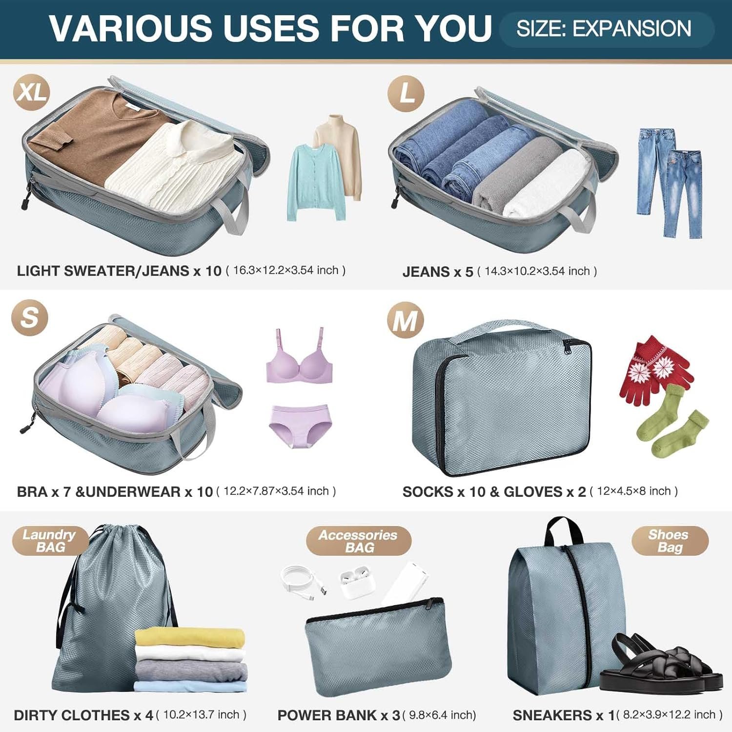 Packaging includes: 7 sets of travel compression bags, one XL cube (x6.4 inches x12.2 inches x3.54 inches), one L cube (14.3 inches x10.2 inches x3.54 inches), one S cube (12.2 inches x7.87 inches x3.54 inches), one M cube (12 inches x4.5 inches x8 inches), and 1 storage bag for dirty clothes (10.2 inches x13.7 inches), 1 storage bag for accessories (9.8 inches x6.4 inches) and 1 shoe bag (12.2 inches x8.2 inches x3.9 inches).