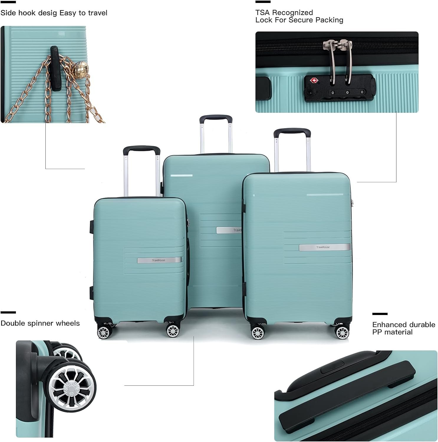 Features 100% PP Material 3-Step Telescopic Handle Spinner Wheels TSA Combination Lock Organized Interior Mesh Zip Pocket
