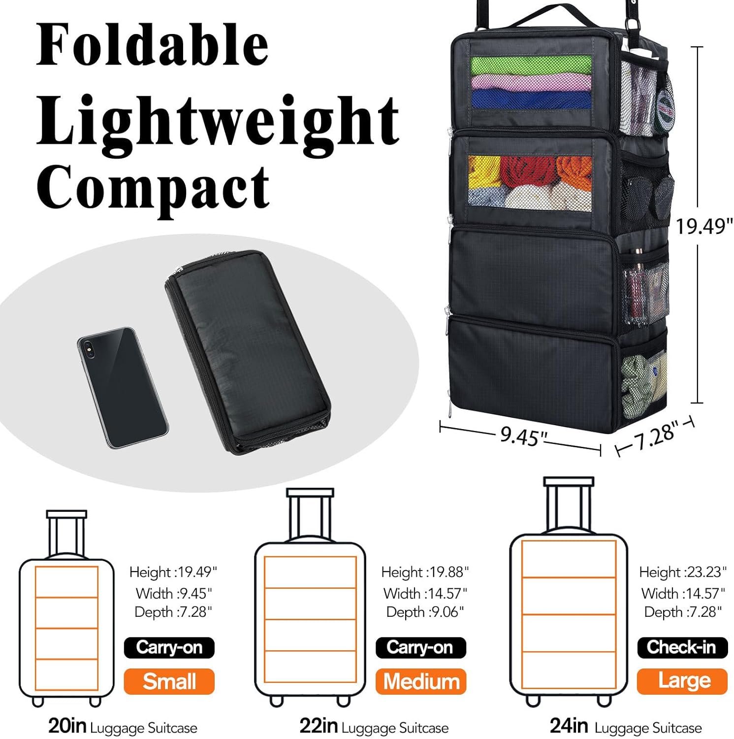 Travel Essentials:The hanging suitcase organizer can accommodate more items for your trip, making it easy to pack a week’s worth of clothes. It is perfect for carry-on luggage. The size of the carry-on hanging closet organizer are 9.45″L x 7.28″W x 19.49″H